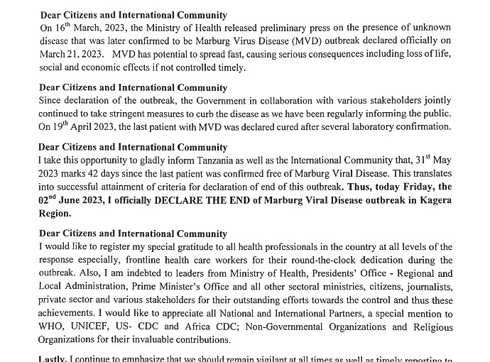 THE END OF MARBURG VIRUS OUTBREAK IN KAGERA REGION - TANZANIA
