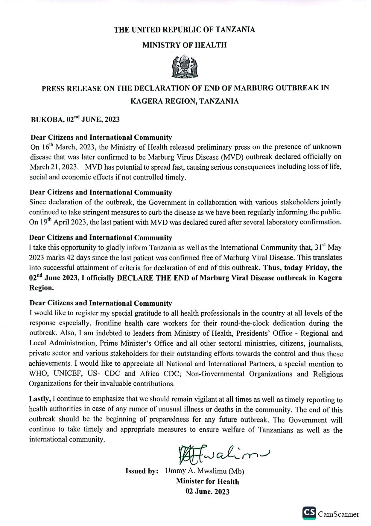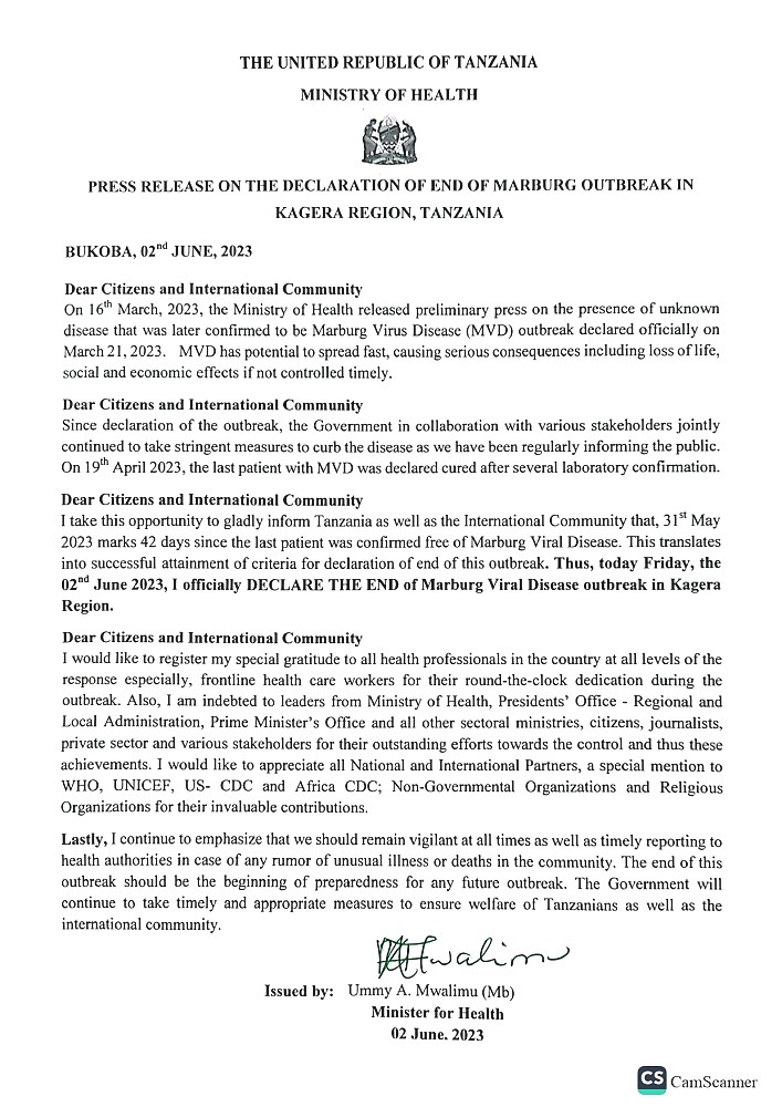On 2nd June 2023, the Ministry of Health Tanzania officially DECLARE THE END OF MARBURG VIRUS OUTBREAK in Kagera region.
