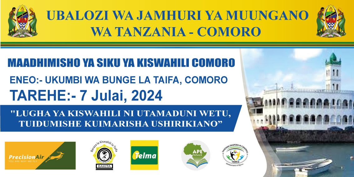 Mheshimiwa Saidi Yakubu, Balozi wa Jamhuri ya Muungano wa Tanzania nchini Comoro anayo furaha kukualika katika Sherehe za Maadhimisho ya Siku ya Kiswahili zitakazofanyika tarehe 7 Julai, 2024 .