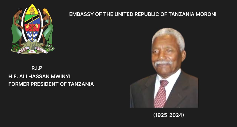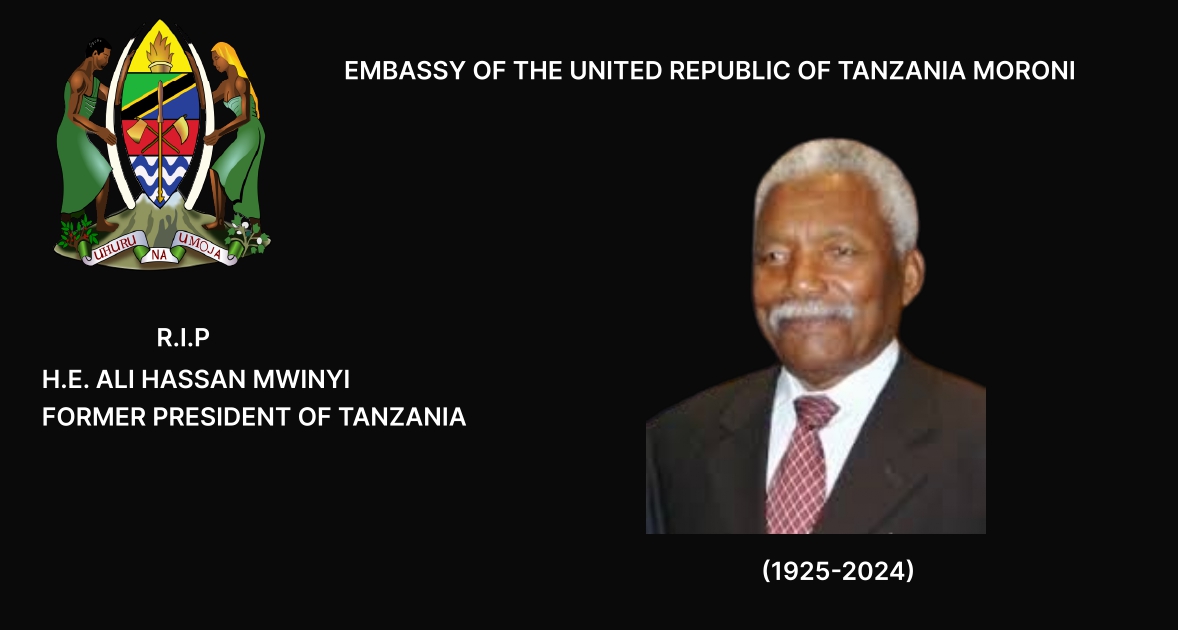 Kwa masikitiko makubwa, Ubalozi wa Jamhuri ya Muungano wa Tanzania nchini Comoro unasikitika kuwajulisha msiba wa Mheshimiwa Ali Hassan Mwinyi, Rais Mstaafu wa Awamu ya Pili wa Jamhuri ya Muungano wa Tanzania (1925 - 2024), uliotokea tarehe 29 Februari 2024.